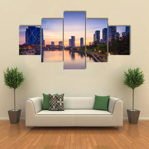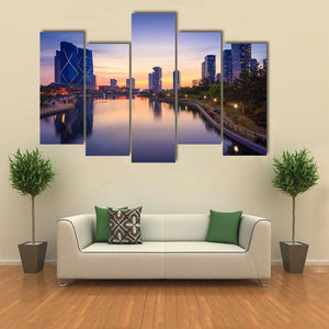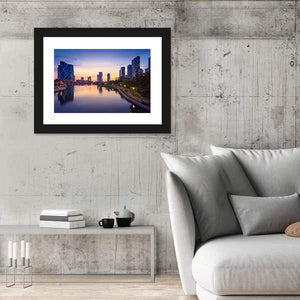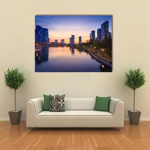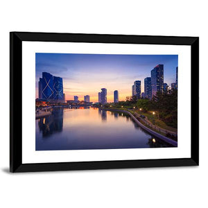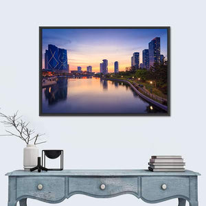 This canvas art features a serene cityscape of Songdo, South Korea, showcasing modern high-rise buildings and a calming river at sunset. The vibrant palette of blues, oranges, and purples adds a tranquil feel to your space.