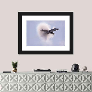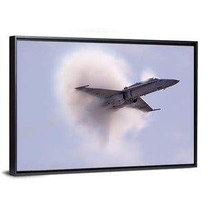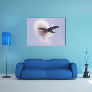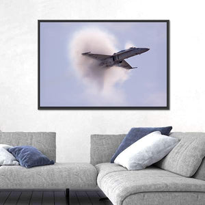 This canvas art captures the powerful moment of a fighter jet producing a sonic boom, with a striking vapor cone formation. The dynamic hues of gray, white, and blue evoke a sense of motion and strength, making it an impactful addition to your wall decor.