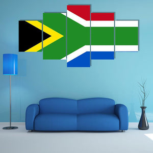 A bold, patriotic canvas print of the South African flag, shown in a clean, symmetrical layout with vivid red, green, yellow, black, blue and white. Its modern style suits contemporary home wall decor and brings a clear national motif to living spaces.