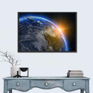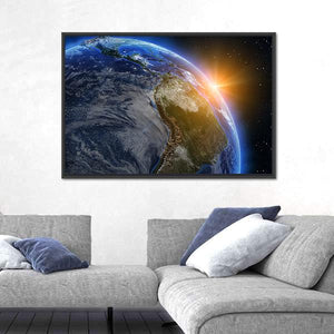 Experience the awe-inspiring beauty of Earth from space with this canvas art featuring a serene sunrise over South America. The dramatic colors of blue, orange, and green evoke a sense of majesty and tranquility, perfect for enhancing your wall decor.