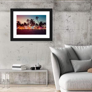 This photographic canvas captures South Beach, Florida at dusk with palm trees, sandy shore and city buildings lit against the evening sky. Pink, blue, orange and purple tones create a tropical, vibrant yet serene atmosphere. Works well in modern or coastal room decor.