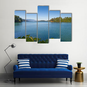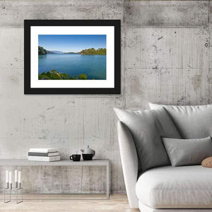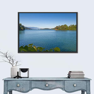 This landscape artwork captures the serene beauty of South Holston Lake, featuring lush trees and hazy mountains beneath a clear sky. The tranquil palette of blues, greens, and browns creates a peaceful atmosphere perfect for refreshing your space.