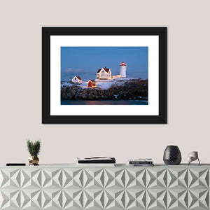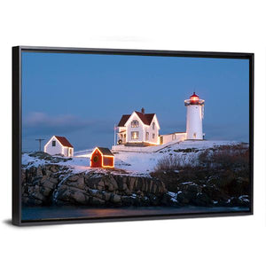 Southern Maine's Nubble Lighthouse appears against a snowy coastal night in this realistic canvas print, with building lights and snow-topped rocks set in a blue, white, red, and gray palette. The rule-of-thirds composition gives the scene a calm, serene mood that suits coastal or modern interiors.