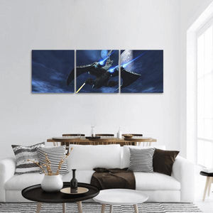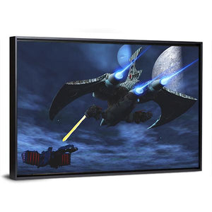 An intense, action-packed digital scene of a dark, angular spaceship firing blue engines and a yellow laser across a cratered planet and cloudy night sky. The panoramic canvas conveys a futuristic space battle mood with deep blues, blacks, greys, and flashes of yellow. It works well as modern wall decor for sci‑fi themed rooms.