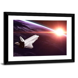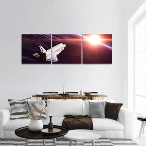 Space Shuttle Taking Off On A Mission Panoramic Canvas captures a space shuttle rising above a planet with a glowing sun on the horizon, rendered in purple, pink, orange and white. The rule-of-thirds composition and modern, dramatic style create an epic, awe-inspiring atmosphere that suits contemporary wall decor.