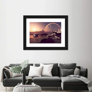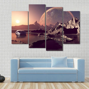 This captivating canvas artwork features a spaceship gliding over a rugged, mountainous alien landscape under a stunning purple and orange sky. The tranquil, surreal vibe makes it an intriguing addition to any room, especially for those who appreciate fantasy and sci-fi themes.