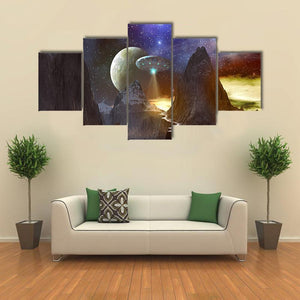 Spaceship Over Mountain Path depicts a flying saucer hovering above jagged alien mountains beneath a large moon and a vibrant, star-filled galaxy. The digital sci-fi scene uses blues, greens, purples and warm browns to create a mysterious, otherworldly mood with strong depth and rule-of-thirds composition. It suits modern home decor and room displays that favor bold, cosmic landscapes.