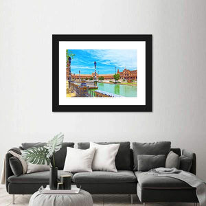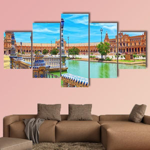 Spain Square in Seville shows an eye-level, realistic view of an ornate bridge, waterway and arched building facade. Its bright, sunny palette of blue, green, brown and white creates a vibrant, peaceful atmosphere that suits modern homes and room decor.