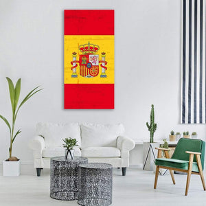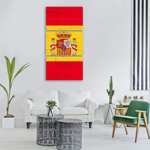 An artful canvas print of the Spain flag featuring the Spanish coat of arms and the pillars of Hercules. The symmetrical, vintage composition uses red, yellow, gold and blue with a distressed texture for a historical, patriotic mood. It suits vintage-inspired or patriotic room decor and spaces honoring Spanish heritage.