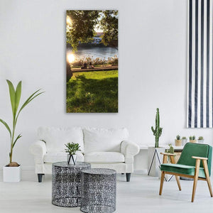 A realistic landscape of a peaceful riverbank in Spanish Guadalquivir Park featuring trees, a waterfront and people sitting. Sunlight filters through the trees and reflects on the water, creating a warm, tranquil late-afternoon mood. The green, blue and gold palette suits nature-focused or modern room decor.