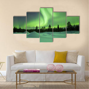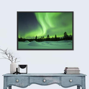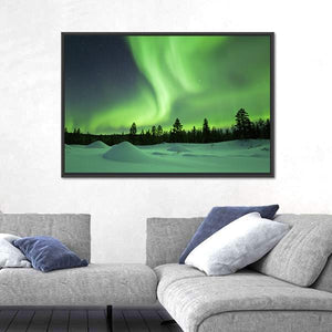 This canvas art brings the magical beauty of the aurora borealis to your space, showcasing vibrant swirling greens against a serene snowy landscape. Dark evergreen trees and a starry night sky create an awe-inspiring atmosphere, perfect for nature lovers.