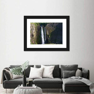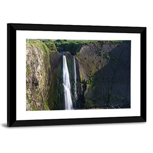 Experience the serene beauty of a waterfall cascading over cliffs, surrounded by lush green landscapes. This realistic nature photography captures the essence of tranquility, inviting a natural touch to your decor.
