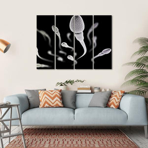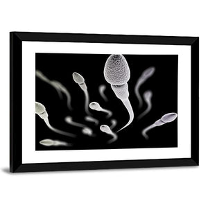 This artwork showcases sperm and cells in a striking composition, emphasizing depth with one sperm in focus against a blurred background. The black canvas provides a modern, clinical vibe that invites curiosity and reflection.