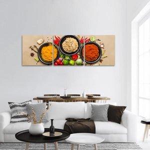 Centered on three bowls of spices with red chilies, a lime wedge, tomatoes and ginger, this canvas brings a fresh, vibrant culinary mood to your wall. The warm orange, yellow, brown and green palette and modern, minimalist styling make it a natural fit for a kitchen, dining nook, or casual café. It’s a colorful, food-focused print that reads as lively yet restrained in a contemporary room.