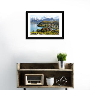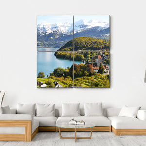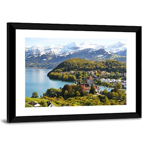This stunning canvas features Spiez Castle nestled among serene lakes, majestic mountains, and vibrant autumn foliage. The elevated perspective captures the picturesque beauty of Switzerland, where a single sailboat glides gently across the water.