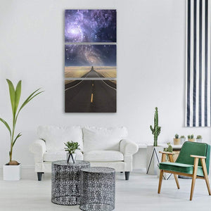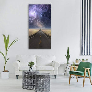 A winding road disappears into the horizon beneath a swirling spiral galaxy and star-filled night sky, creating an ethereal, hopeful scene. Rendered in deep blues, purples, pale yellow and tan, the modern surreal landscape uses a vanishing-point perspective to draw the eye and fits well in modern or contemporary rooms like living rooms and bedrooms.