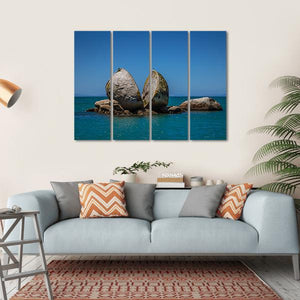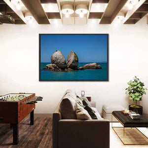 This canvas artwork captures the serene beauty of Split Apple Rock in New Zealand, showcasing a split rock formation by the ocean under a bright sky. Two birds perched on the rocks add a natural touch to the scene.