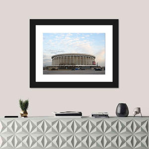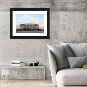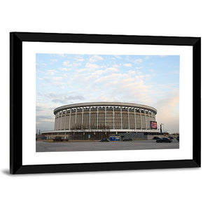 A cityscape of a sports and concert stadium in Russia captured at eye level. Muted blues and greys, a circular stadium with vertical supports, scattered cars and a cloudy daytime sky create an urban, architectural mood. Suits modern or industrial room decor as a subtle wall piece.