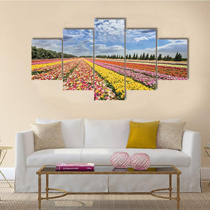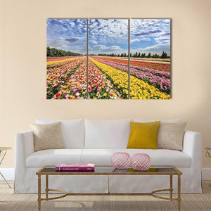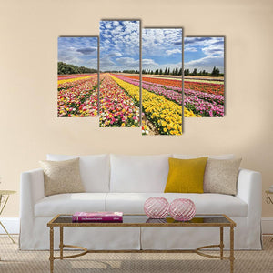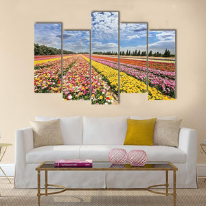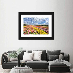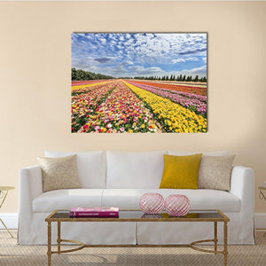 This print depicts a spring flower field with rows of colorful ranunculus and buttercups beneath fluffy white clouds. Its photorealistic look and pink, yellow, green and blue palette create a vibrant, cheerful, expansive mood suited to modern home and room decor.