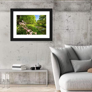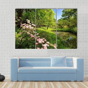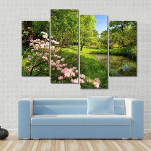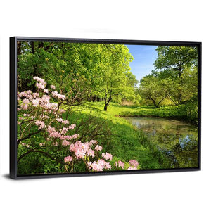This canvas art captures a peaceful spring scene with vibrant pink rhododendrons, lush green trees, and a serene pond. Perfect for adding a touch of nature's tranquility to any space.