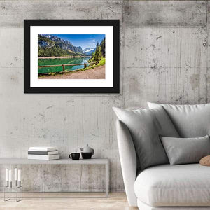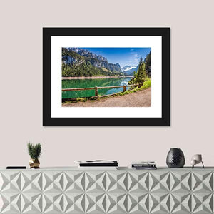 Spring Sunrise at Gosausee Lake depicts a lake framed by snow-capped mountains and a coniferous forest, with a wooden fence and calm water reflecting the sky. The realistic scene uses green, blue, white and brown tones to convey a peaceful, serene, grand mood that suits modern or nature-themed rooms like living rooms or bedrooms.