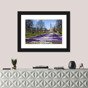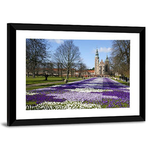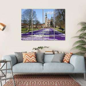 This canvas wall art beautifully captures the vibrant charm of Rosenborg Castle in Copenhagen, surrounded by a picturesque field of crocuses and lush trees. The serene color palette features shades of purple, white, green, brown, and blue, creating an inviting atmosphere for any space.