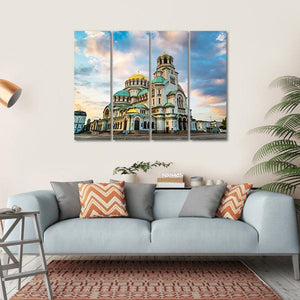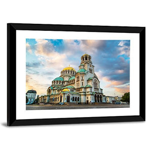 This canvas art features the stunning St Alexander Nevsky Cathedral, showcasing its majestic golden domes and ornate facade against a backdrop of dramatic clouds. The serene color palette blends white, green, and blue, evoking a sense of awe and tranquility.
