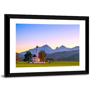 A peaceful evening landscape of St Coloman Church in Bavaria, featuring a white church with a tall steeple framed by tall green trees and snow‑capped mountains. The realistic, rule-of-thirds composition uses soft blues, pinks, yellows and greens to create a calm mood, a good fit for living rooms, entryways, or studies.