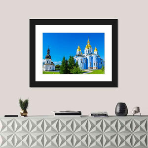 This canvas art beautifully depicts a church with majestic golden domes under a bright blue sky, surrounded by lush green trees. Its realistic style captures a peaceful atmosphere, making it an uplifting addition to any space.