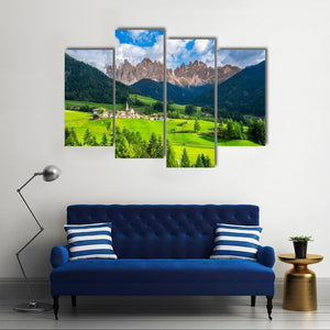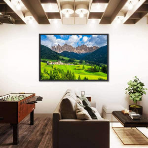 A realistic landscape of an alpine village beneath the jagged Odle Dolomites, with green hills, forest and a church steeple under fluffy clouds. The composition uses rule-of-thirds and layered depth to create a serene, picturesque mood. Suited to modern or nature-inspired rooms as understated wall decor.