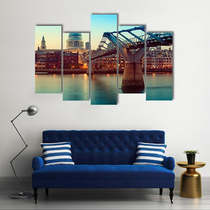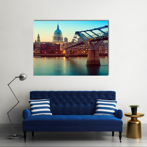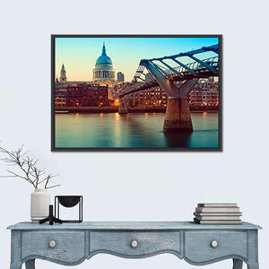 This canvas art captures the serene beauty of St Paul's Cathedral and the Millennium Bridge against the shimmering River Thames. With a twilight hue palette of blue, teal, and gold, it creates an iconic urban scene full of depth and reflections.