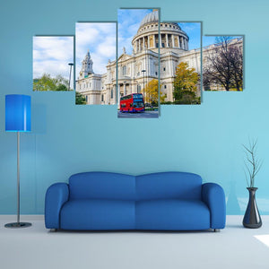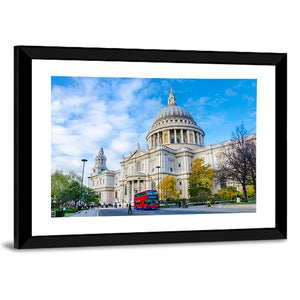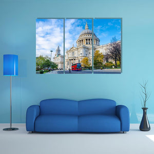 This canvas print captures the iconic St. Paul's Cathedral against a bright, sunny backdrop of London. Its photorealistic style showcases the grand dome and a vibrant red double-decker bus, adding an urban touch to any space.