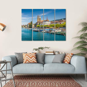 This canvas wall art features a serene view of Lake Zurich, showcasing a vibrant city skyline, a peaceful river, and charming boats. The lush greens and deep blues create a lively atmosphere that brings a touch of nature indoors.