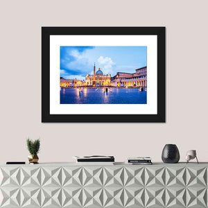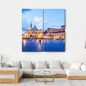 Capture the grandeur of St. Peter's Basilica with this stunning canvas wall art. Featuring a wide-angle view of this historic Vatican landmark, the piece showcases its symmetrical facade against a serene dusk backdrop. The subtle palette of blues, whites, and golds brings a tranquil elegance to any space.