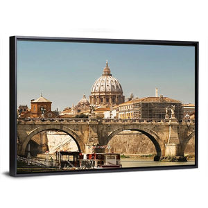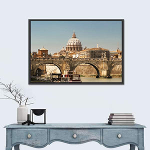 This canvas art captures an eye-level view of a historic bridge crossing a serene river, with the majestic dome of St. Peter Basilica rising in the background. The bright palette of blues, tans, and browns evokes a scenic and timeless atmosphere, making it a wonderful addition to your home decor.