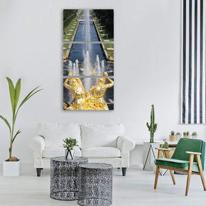 This canvas shows a St Petersburg fountain framed by gilded statues, water spouts and a canal in a balanced aerial composition. Gold, blue and green tones give the scene a grand, opulent, majestic feel that suits classical or ornate interiors as room decor.
