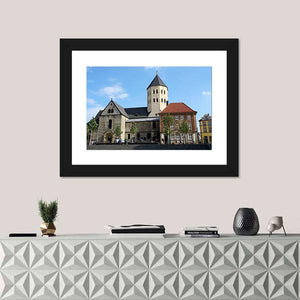 St Ulrich Church in North Rhine, Germany appears as a realistic daytime scene: a stone church with a tall tower set among red-roofed buildings, trees, and a clear blue sky. The bright, historical mood pairs with blue, gray, brown, and white tones and suits classic or modern interiors.