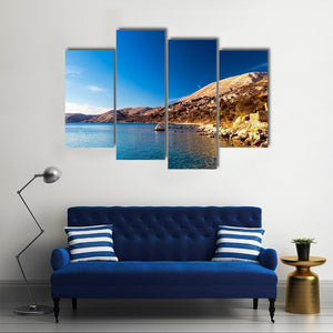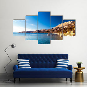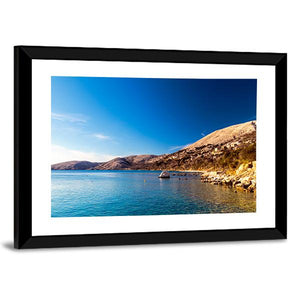 Stara Baska Village in Krk Island depicts a calm coastal landscape with water, a rocky shore, and a hillside settlement. Rendered realistically in blue, tan, green and white tones, it creates a serene, bright, peaceful mood suited to coastal or modern room decor.