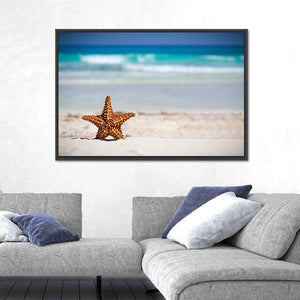 A single starfish rests on Caribbean sandy shore in a calm, minimalist composition that emphasizes beach and ocean elements. Muted browns, tan, blue, and white create a serene, peaceful mood that fits modern, coastal, or minimalist rooms.