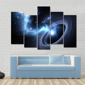 This canvas wall art showcases a black hole, surrounded by swirling cosmic dust and distant stars. The deep blues and blacks create a mysterious, awe-inspiring atmosphere, perfect for modern décor.