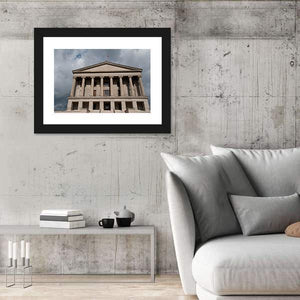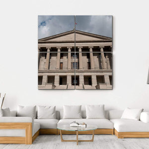 This canvas showcases the grand Neoclassical architecture of Nashville's State Capitol, featuring its prominent columns and an American flag. The striking palette of grey, white, blue, and brown conveys a classic and imposing atmosphere.