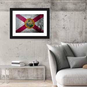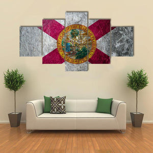 This canvas shows the State of Florida flag with the state seal centered and a distressed, grungy finish. The symmetrical, vintage treatment and patriotic color palette (red, white, grey, green, blue, yellow) give it a worn, rustic feel. It works well as house or room wall decor that leans rustic or modern.