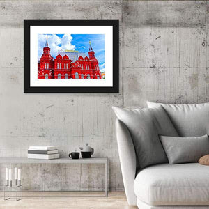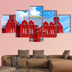 This canvas depicts the State Historical Museum on Manezhnaya Square in Moscow, featuring the museum’s red façade, spires, and ornate golden finials. The symmetrical, realistic composition sets the building against a bright blue and white sky, giving a grand, historic, and vibrant mood. It works well as a strong focal piece in modern or traditional home décor.
