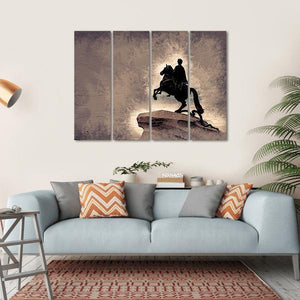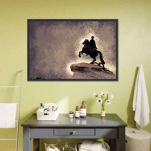 This canvas artwork depicts the equestrian statue of Peter the Great, capturing the dynamic motion of the horse and rider. The dramatic palette of browns, blacks, and greys creates a powerful atmosphere, making it a striking addition to any wall decor.