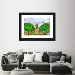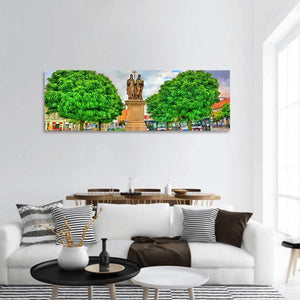 This panoramic canvas shows the statue of Saints Cyril and Methodius in the Czech Republic, set among lush green trees with buildings and a bus in the background. Realistic and vibrant, the wide composition uses green, brown, blue and red tones to capture a lively daytime urban scene that suits living rooms, offices, or entryways seeking a colorful focal point.
