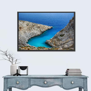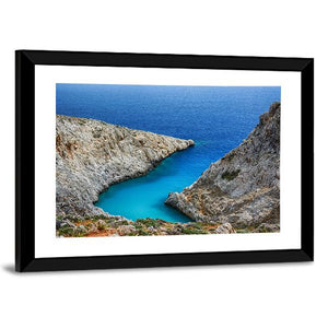 Stefanou Beach in Crete is shown as a realistic landscape of an ocean cove with rocky coastline and clear turquoise water. The scene feels serene and natural, with blue, white, green and brown tones, and it suits coastal or modern room decor.