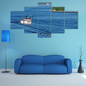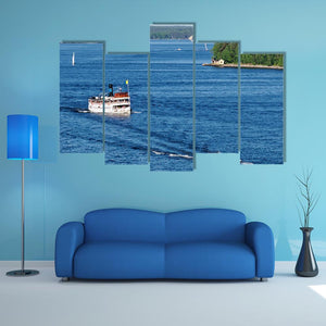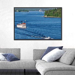 This landscape canvas features serene blue waters, lush green islands, and soft white clouds, capturing the essence of summer in Sweden. The realistic portrayal of boats gently navigating the water brings a peaceful ambiance to any space.
