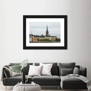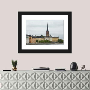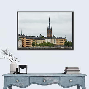 This canvas depicts a Stockholm cityscape centered on a tall spired church tower and a row of historic buildings along a tree-lined waterfront. Muted yellow, grey, and blue tones give the scene an overcast, urban-historic mood. The architectural style and calm palette suit modern or architectural interiors and work well as wall decor for home spaces.