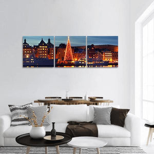 A panoramic cityscape of Stockholm’s Old City at night, showing a decorated Christmas tree, buildings with lit windows, and boats on the water. The photorealistic print uses blue, orange, yellow and white tones to create a festive, illuminated urban mood and suits modern living rooms or offices.