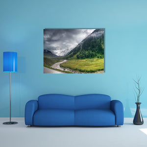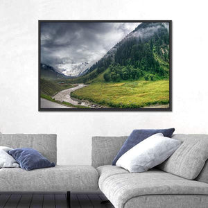 Storm Clouds Over Mountains Of Ladakh shows a winding river and forested mountains under a stormy, misty sky. The green, blue, grey, and brown palette creates a dramatic but quietly serene mood, suited to modern or nature-themed rooms.